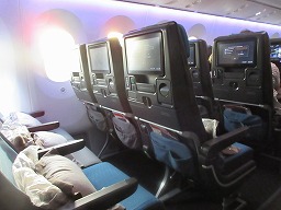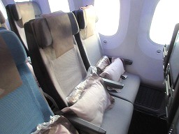 | シートには、毛布、枕。 個人用モニター(機内エンターテインメント:KrisWorld)、USB充電ポート、ヘッドレスト(可動式のサイドウィング)。 |
