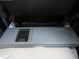 | シートポケットには、機内ショッピングカタログ、機内無料WiFi案内、安全カード、紙袋。折り畳みテーブルは、ミラー付き。 |