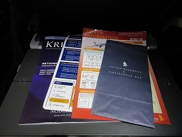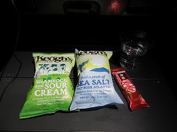 | 関西空港からシンガポールまでは、In-flight Snacksサービスがあります。ポテトチップス/コーンチップス、ポップコーン、グラノラバー、ドライフルーツ、チョコレートバー、ビスケットがありました。ポテトチップスとチョコレートバーを頼んだらコーンチップスもついてきました。チョコレートバーはキットカットでした。 |