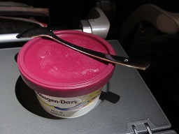 | 食後に、ハーゲンダッツのアイスクリーム(バニラ)。エコノミーでも手軽に世界的ブランドのアイスを楽しめるのが嬉しいポイントですね。そして、コーヒー・紅茶・緑茶のサービス。 |