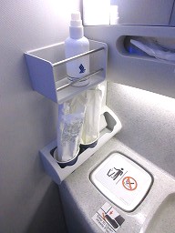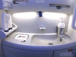 | ハンドソープ、ハンドローション、歯ブラシセット、女性用サニタリー用品、紙袋、紙コップがあり、いつも綺麗に保たれていました。シンガポール航空のハンドローションすごくいい匂いがするんですよ〜。 |