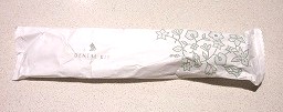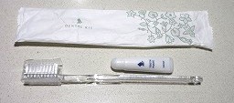 | エコノミークラスのトイレには、歯磨きセットも置かれています。袋は紙製。歯ブラシはカバー付き。歯磨き粉にはシンガポール航空のロゴ入り。 |