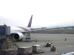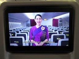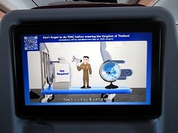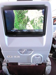 | 関西(KIX)11時出発、バンコク(BKK)15:45着のTG623便です。長距離用のワイドボディ機なので、座席間隔や頭上スペースが比較的ゆったり。大きめの個人用モニターがあり、映画や音楽など充実していますが、内容は古いものが多かった。 |