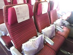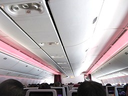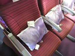 | 機内は満席。エコノミークラスは、3-3-3の並び席。中央の通路側の席にしました。 シートには、イヤホン、枕、毛布が置かれていました。 |