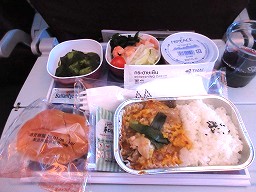 | 離陸後、安定飛行に入ると機内食のサービスが始まります。 機内食は2種類(チキンかポーク)から選べました。チキンにしてみました。日本の親子丼のような味。ごはんとおかずが混ざらないように、紙製のおかずカップにチキンの汁ものが入り、ごはんと分けられていました。紙お手拭き付き。飲み物(アルコールやコーヒー・紅茶)は機内食を配った後から出されます。ワインやビールとか食前だったらいいのにな。 |