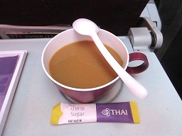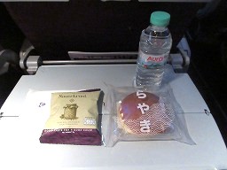| バンコク到着1時間30分前になると、2回目の機内食サービスが始まりました。どらやきと日本語で書かれたタイ製抹茶クリーム入りどらやきと一口サイズのタイ製ライスクラッカー。 |
