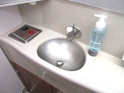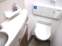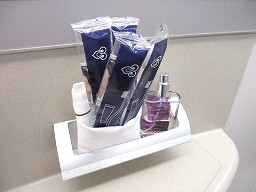 | トイレには、ハンドソープ、紙コップ、タイ製オーデコロン。オーデコロンは、Silk Routeの名前が付いたタイ国際航空のために特別に手作りされた香りです。香りが強すぎず、短時間でほのかに香るタイプでした。 |