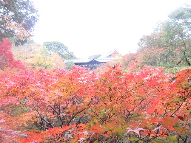 東福寺は、京都駅からひと駅のところにある大きなお寺で、秋になると境内の谷がまるごと真っ赤に染まることで有名です。