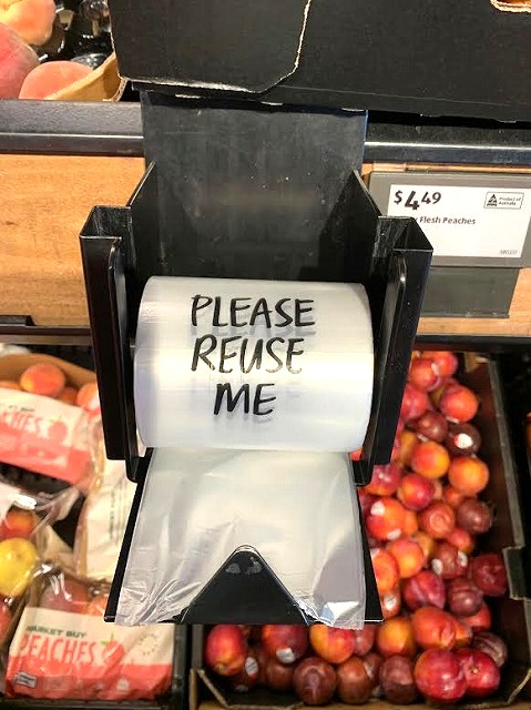 オーストラリアのスーパーマーケットALDI(ドイツ発祥のスーパーマーケットチェーン)で野菜を入れるためのビニール袋を取ろうとしたとき、袋に 「Please Reuse Me」 と書かれているのを見かけました。