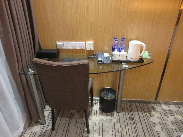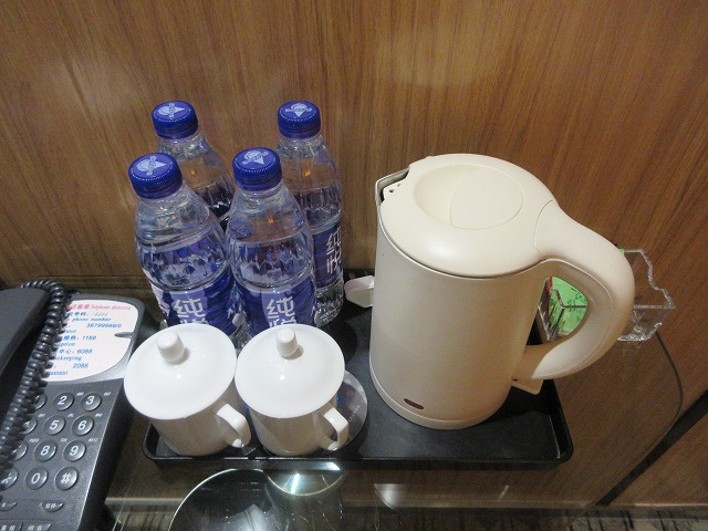 部屋のテーブルには、湯沸かしポット、お茶(云南紅茶x2、清新緑茶x2)、フタ付きカップ、ミネラルウォーター4本。有線インターネット。ホテルのロゴ入り封筒、便箋もありました。また、最近あまり見かけられなくなった裁縫セット も用意されていました。ボタンが取れたときや洋服のほつれが気になったときにすぐ使えるので、旅行中でも安心です。